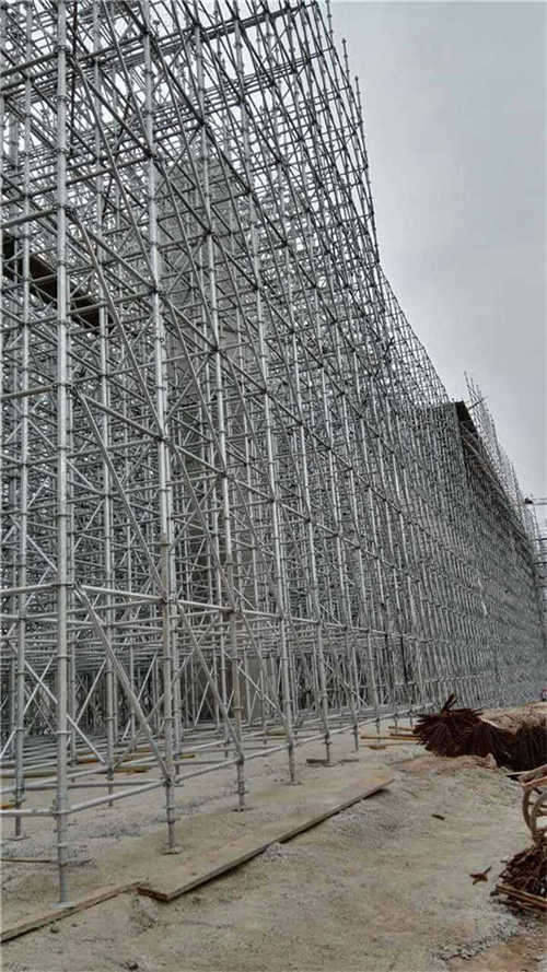 步骤2:在爬梯入口位置安装1个底层门架,将门架立杆套进可调底座,同样方法在对面安装2个中间层架,并安装横杆、斜拉杆将底层门架和中间层架连接固定;